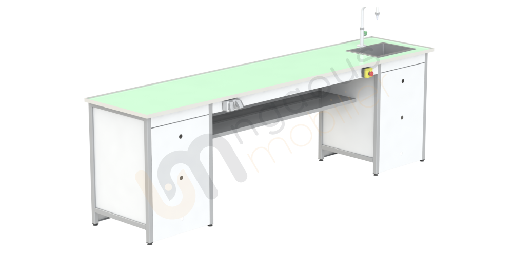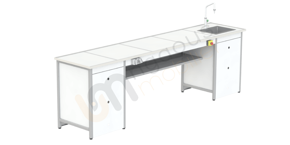 • Paillasse humide avec table de travail pratique en top résine ou carreaux gris ou verre trempé , et structure métallique revêtue en matériaux résistants aux agents agressifs